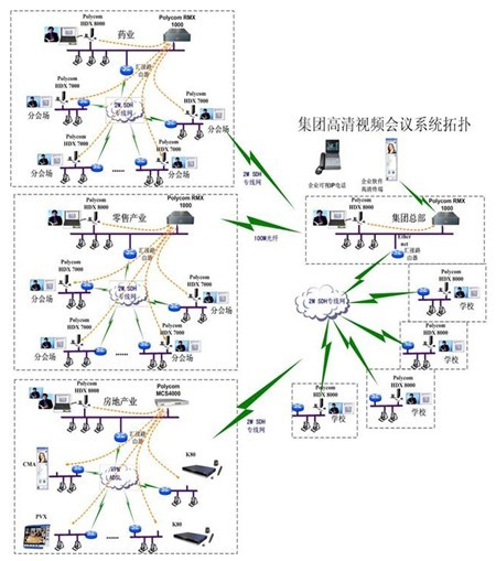 隨著我國改革開放的不斷深入,為加快信息交流速度,保證信息暢通,為滿足某集團視頻會議應用的需求,某集團將基于SDH專線網(wǎng)絡及VPN ADSL專線,利用先進的通信傳輸技術,組建統(tǒng)一的信息傳遞寬帶通道,連接從某集團總部到零售業(yè)集團分部、房地產集團分部、藥業(yè)集團分及學校部分的四大分部,各分部各自下轄相應分支機構,其中零售分部為2M SDH專線網(wǎng)絡,房地產分部為VPN ADSL專線網(wǎng)絡,藥業(yè)集團暫時不會建設系統(tǒng),后期建設可以以零售業(yè)分部作為建設模板參考。學校部分的會場目前網(wǎng)絡是直接接入某集團總部,因此視頻會議系統(tǒng)中,學校部分會場全部直接接入總部,從而組成一套完整的視頻會議系統(tǒng),形成覆蓋整個企業(yè)集團。